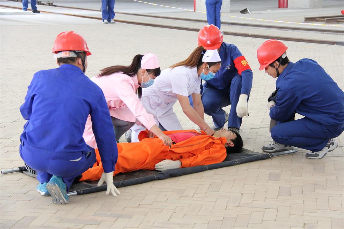 本次演练共分三部分。第一部分为电石车间电石炉内硅铁流出,烧穿炉舌,造成炉舌漏水爆炸致一人背部烫伤事故;第二部分为原料车间1#石灰窑5#燃烧室发生闪爆致一人双手烫伤事故;第三部分为机电车间变电站值班员在对110KVGIS室进行日常巡视、抄录SF6气压表时,发生中毒晕倒事故。演练过程中,救援人员按照预案,各司其职,有条不紊地进行了伤员救治和事故应急处理,取得了良好的演练效果。