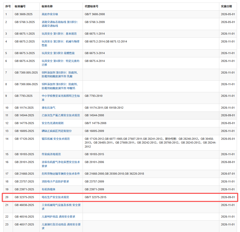 强制性国家标准GB 32375-2025《电石生产安全技术规范》于2025年10月5日正式批准发布,将于2026年9月1日起正式实施。