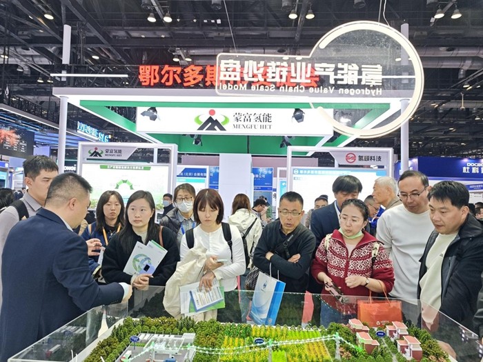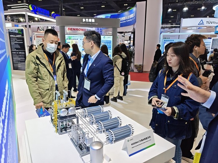 该展台上还展出了4000标准立方米/时的海水直接耦合制氢系统模型。通过该模型的演示,记者可以清楚地看到海水无需淡化,即可实现直接制氢的过程。在实际使用中,该装置可以大大减少占地面积。该工作人员解释:“装置中的水处理系统无需额外耗电,仅靠装置本身的余热驱动。此外,装置还可应用于污水制氢场景。”