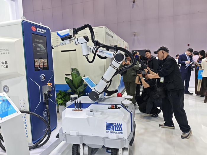 制氢安全不容马虎。在国家能源展台,一位名为“氢巡”的“哨兵”正在现场演示。这是国能防爆智能巡检机器人,也是全球首台氢能场景AI智能多轴协同巡检机器人。据展台工作人员介绍,该机器人融合了激光SLAM、惯性导航与RTK高精度定位技术,实现了巡检电位厘米级精准定位,可实时监测多种气体泄漏、温度异常、仪表读数等关键参数,工作时续航可达8小时,为氢能设施安全保驾护航。