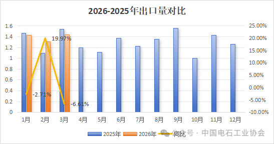 据海关数据显示,2026年3月我国电石出口1.44万吨,较去年同期减少6.61%,1-3月累计出口量4.18万吨,同比增长1.85%。3月份出口均价3687元/吨,同比下降3.9%。